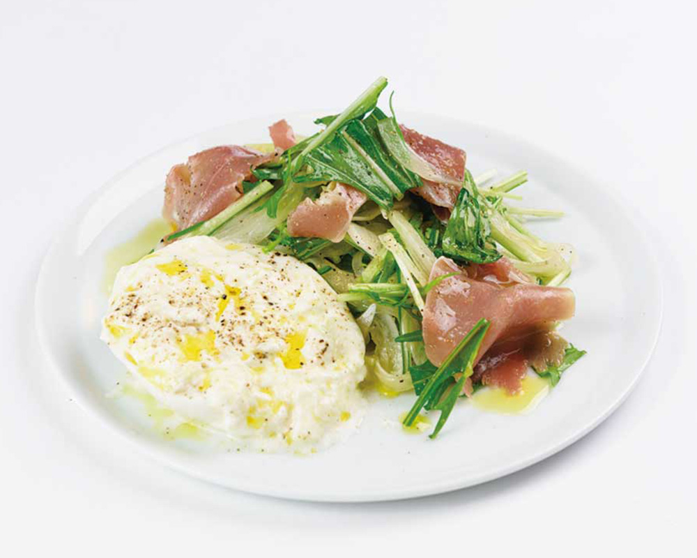 ブッラータ(フレッシュチーズ)&ハモンセラーノ(生ハム)の贅沢サラダ 890円(961円)
